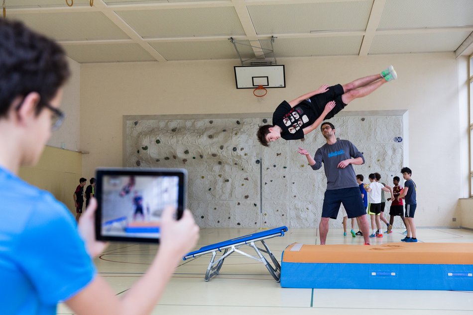Unsere Sportanlagen sind ebenfalls auf dem neusten Stand: Neben den Turnhallen haben wir verschiedene Aussenplätze, ein Beachvolleyball-Feld und einen Spinning-Raum.